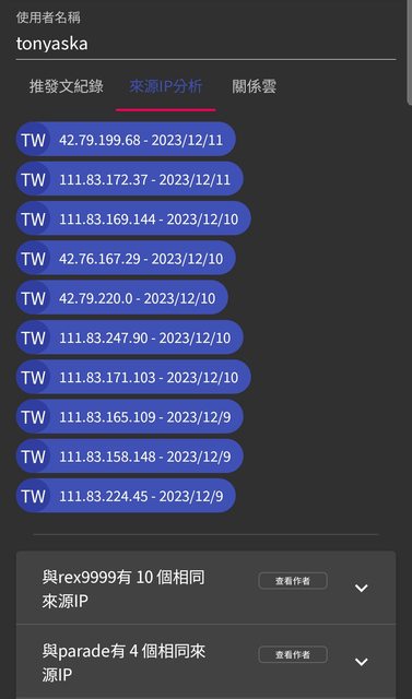 而經過查詢後rex9999,tonyaska,parade三人IP高度重複。