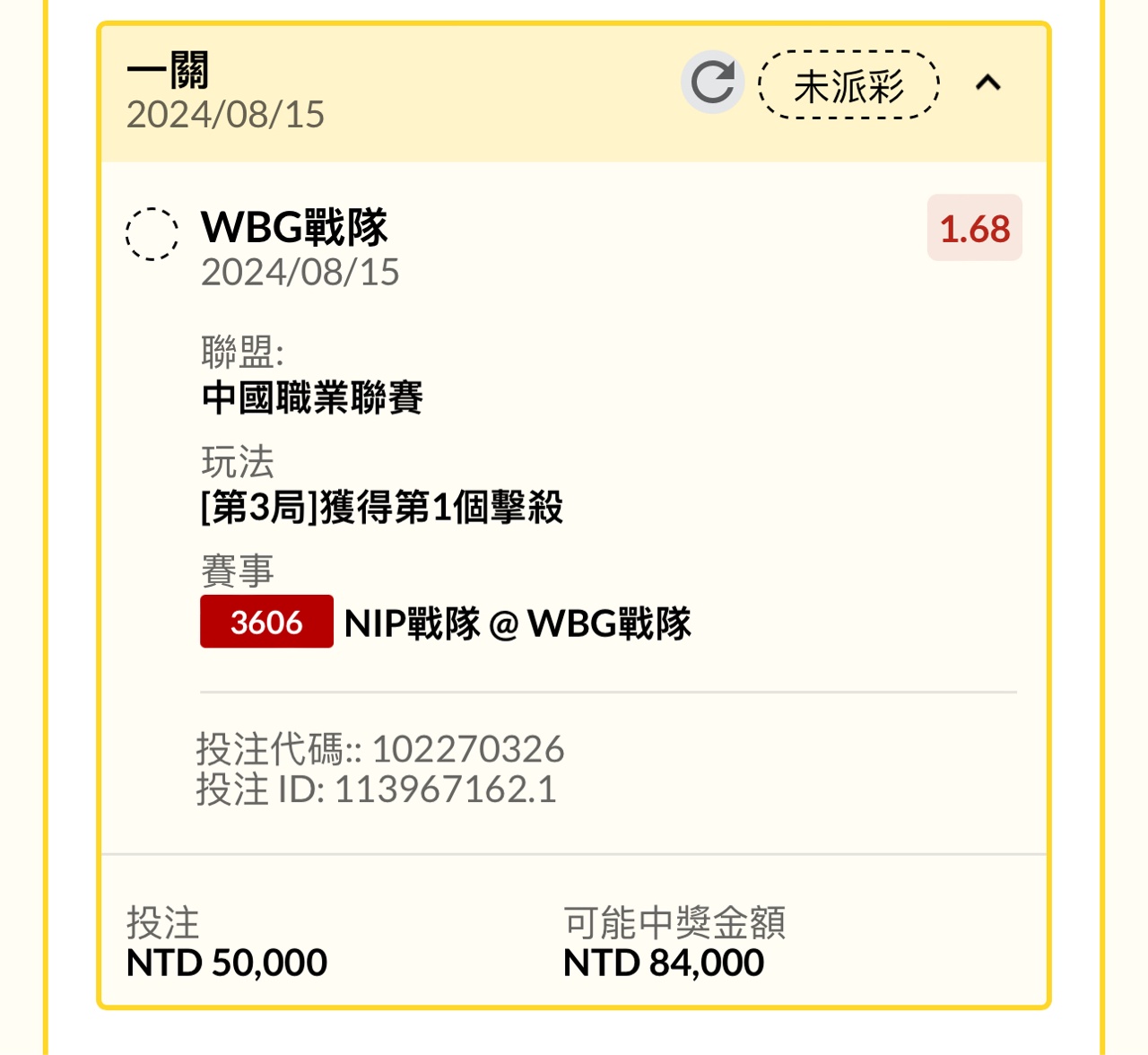 → lampar5566: Wbg第一盤 1.55 買500!拼 42.72.230.56 08/15 18:19
