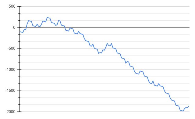 有趣的是,如果每場只用50元買兩個正比,不碰別的,結果是正的,
