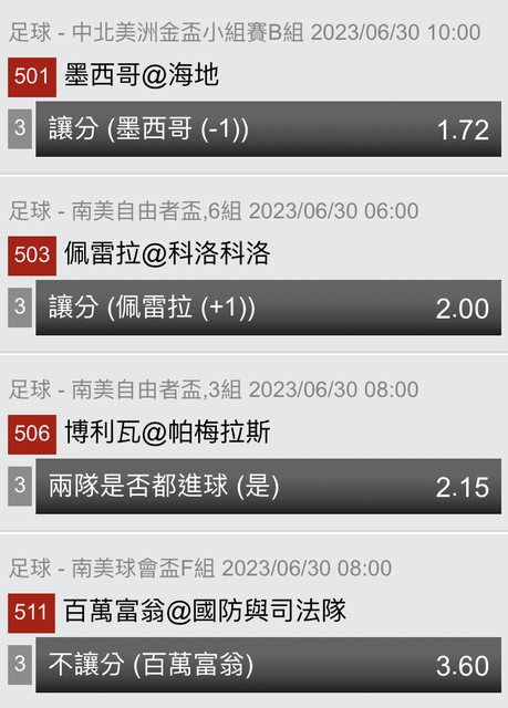 標題[足球] 6/30 南美 美金 自由盃