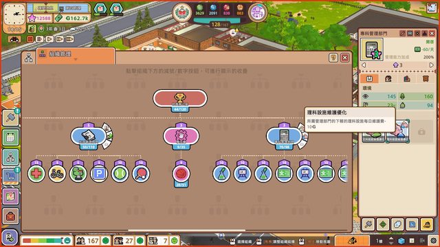 玩家剛開始只有一些基本的BUFF能選,像是維護費降低、增加滿意度之類的,