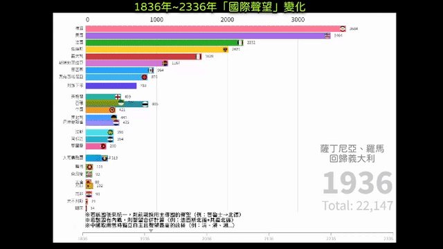 他們歷年的國際聲望做成「賽跑長條圖」