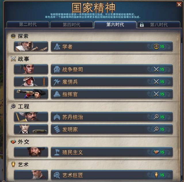 國家精神分別在時代2、4、6、8可以選擇(這些時代都有完全不同的選擇)