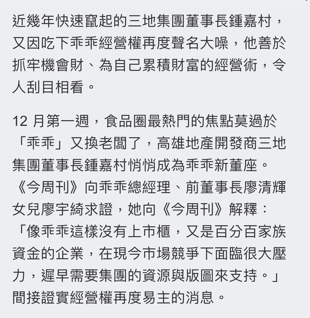 十大股東之一的乖乖也被董事長鍾嘉村買下