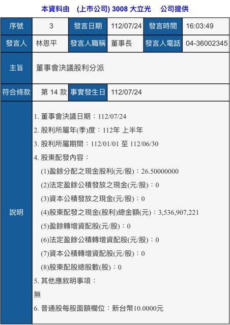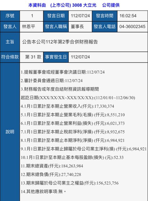 1. 標題:3008 大立光112年第二季合併財報&股利分派