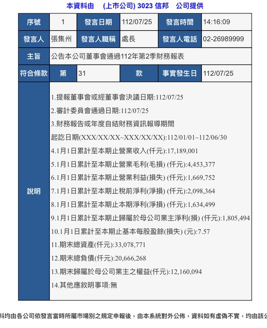 標題[情報] 3023 信邦 112年Q2財報&除息基準日