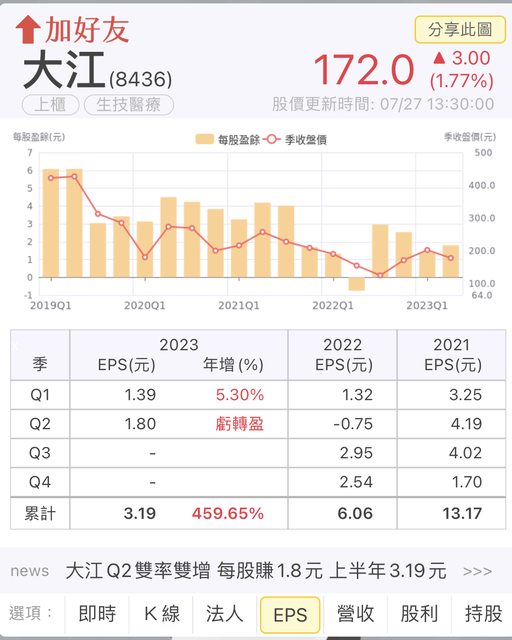 大江 (8436-TW) 在海外市場成長下,第二季雙率雙增,並較去年轉盈,稅後純益增至 2.09 億元,每股純益 1.8 元;上半年純益 3.72 億元,年增 458.09%,每股純益 3.19 元。