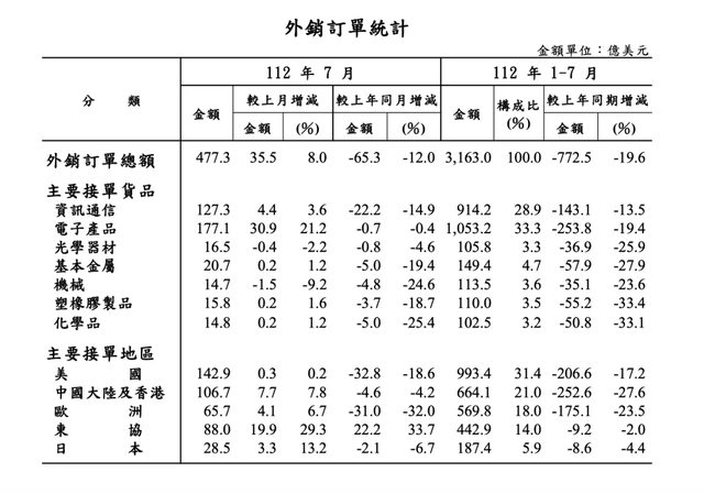 累計1-7月的外銷接單為3,163億美元,年減19.6%。