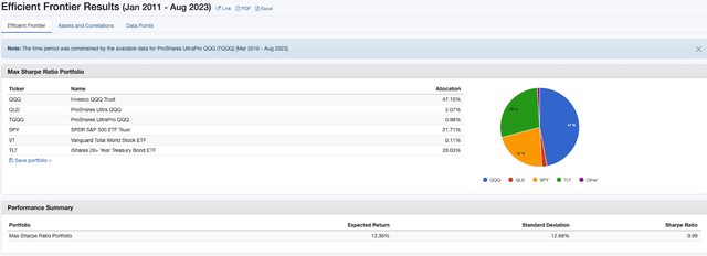 最接近效率前沿切線的資產配置是約等於 QQQ&SPY 買 70% + 長債TLT 買30%