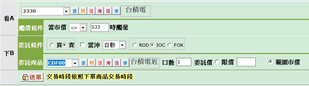 推 kizo : 用智慧單,看A作B,價格<=xxx就市價賣出一口股期 09/19 14:32