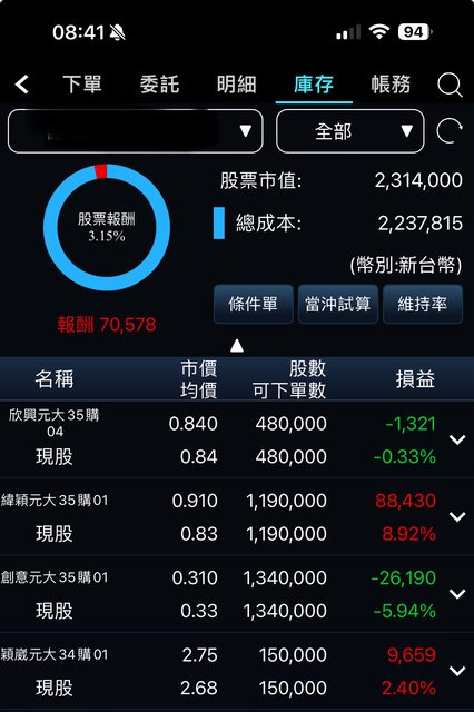 : 掉,並補回原本的3張穎崴,再補了一點權證回來