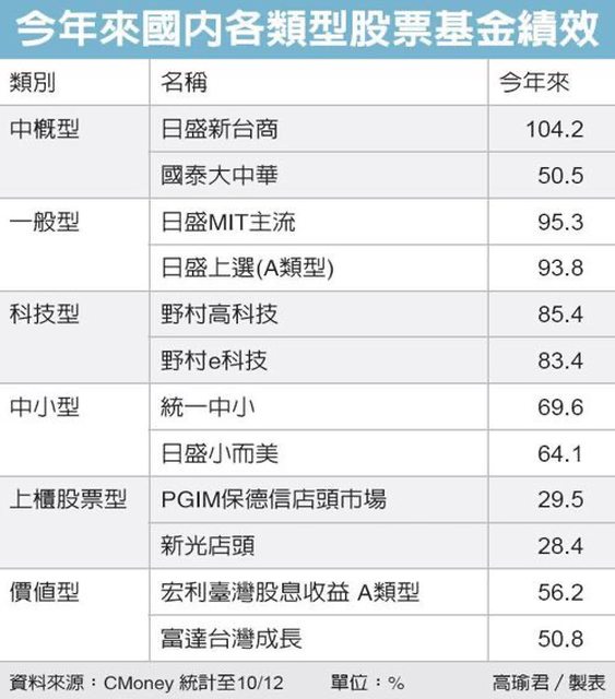 以個別基金來看,今年以來以中概型基金的日盛新台商基金上漲104.2%表現最為亮眼,其次