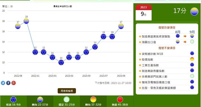 : 經濟處副處長邱秋瑩表示,112年9月景氣對策信號綜合判斷分數為17分,較上月增加2