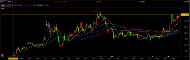 日k準備三角收斂,月k超大W底,來到大頸線位置,距離20年高點39.4不到一根的距離