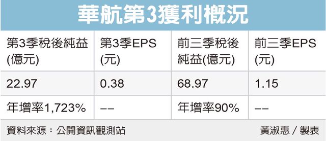航空客運市場旺,華航(2610)昨(8)日公告第3季財報,單季稅後純益約22.9億元,年增1,723.8%,每股純益(EPS)0.38元;累計前三季税後純益約68.9億元,年增90.6%,EPS為1.15元。