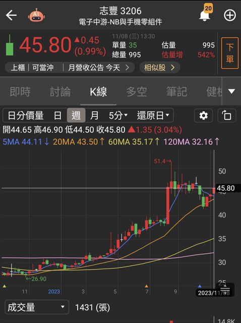 C.技術面:自八月創下歷史新高價後,量縮區間整理,近期依然低量但股價緩步上揚