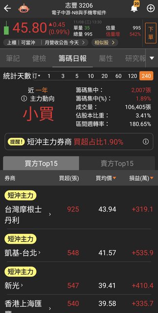 D.籌碼面:近240日持有最多張數的主力均價落在43.94 與當前價格相差不遠,近日無明顯