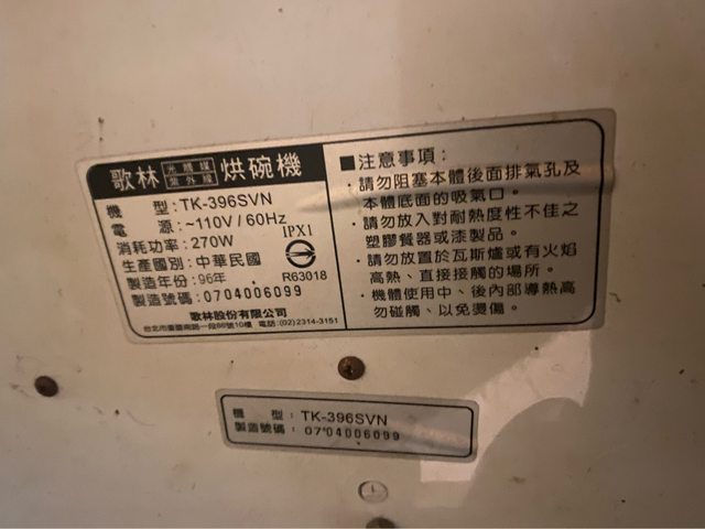 歌林烘碗機 2007年出廠