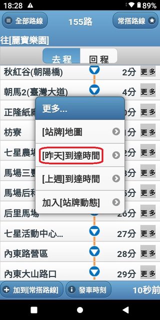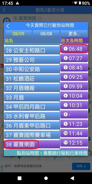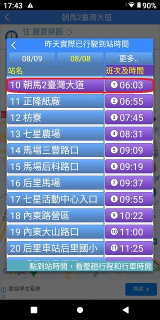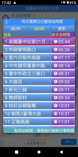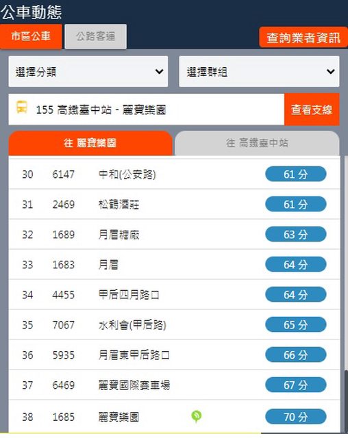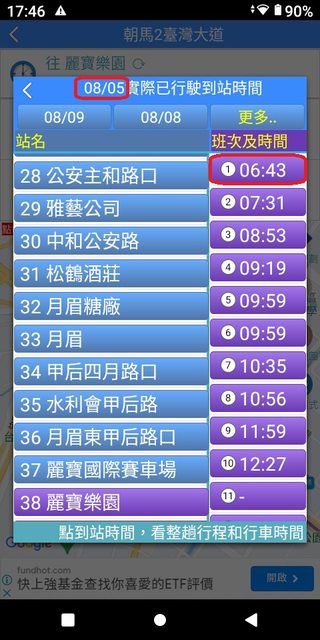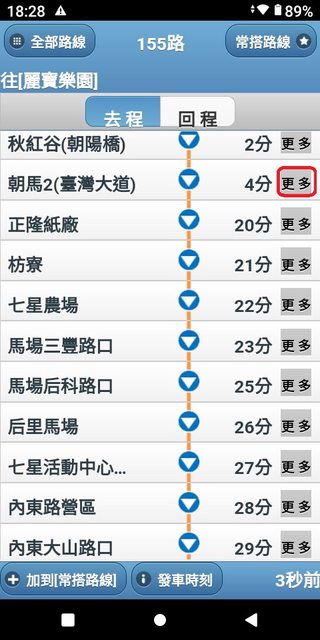 朝馬 6:03 麗寶 6:51 加減得知朝馬到麗寶,約48分鐘。 3.複雜版APP--台中公車何時來