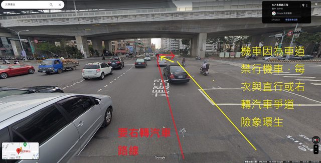到這邊機車又得切過去,但很多車會在這邊右轉