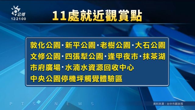 到11處周邊自由觀賞點,包括逢甲夜市、台中市政府前廣場、敦化公園、水湳水資源回收中