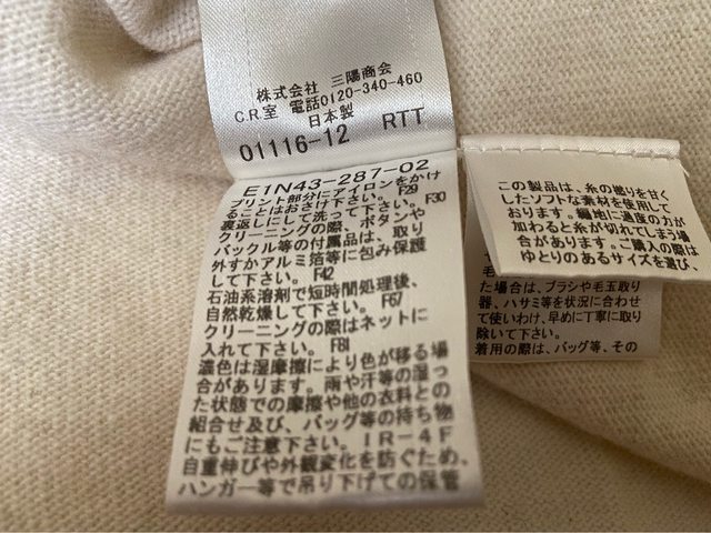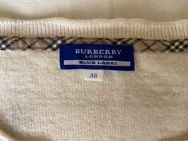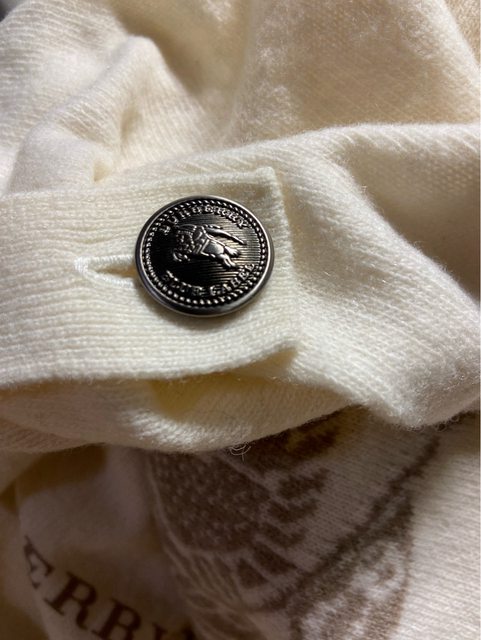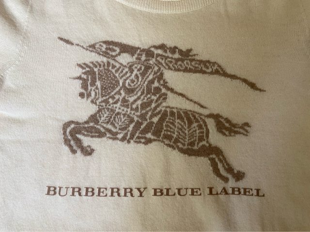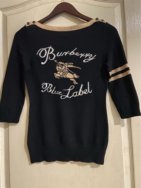 38號 九成新 無褪色 水鑽完整 七分袖 100%棉 但有一處縫補過 因為是黑色 我穿上覺得不明顯 介意勿購買 3.Burberry blue label 米白色戰馬標誌羊毛上衣 1490含郵局運費