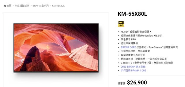 物品 : SONY 索尼 BRAVIA 55型 4K HDR LED Google TV顯示器(KM-55X80L)