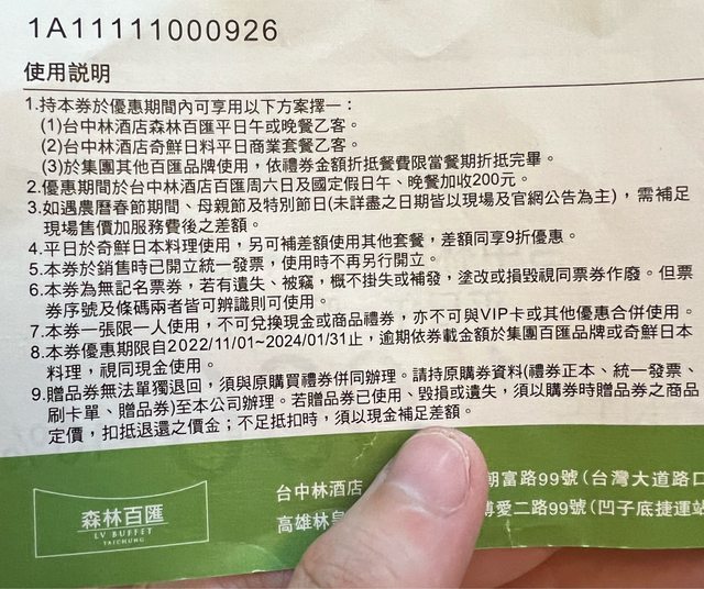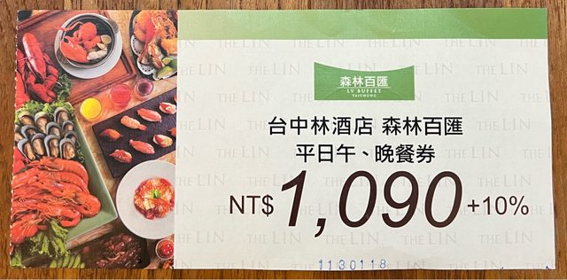 4.物品:台中林酒店 森林百匯 平日午晚餐券 1090
