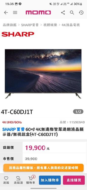 提供Momo售價參考 sharp 60吋電視4T-C60DJ1T 價格$13500 還未提供地址可直接寄送 提供Mono售價參考 https://i.imgur.com/puV6DM6.jpeg