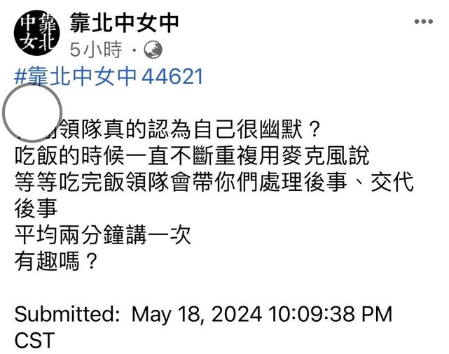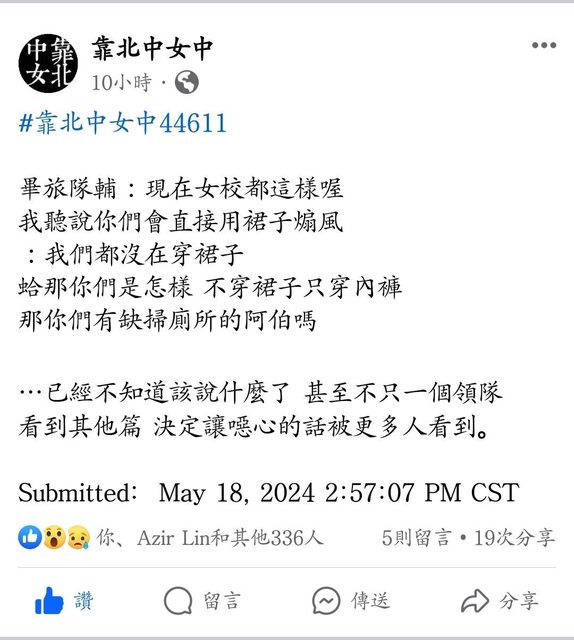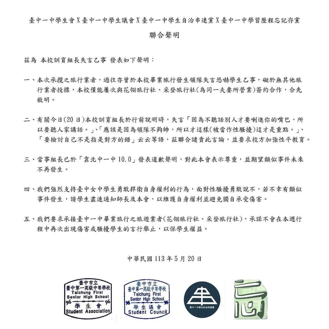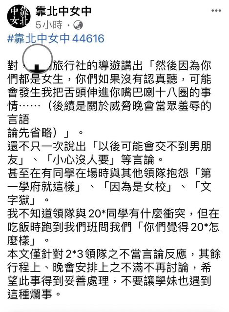 https://udn.com/news/story/6898/7975047 台中女中畢旅爆領隊言語騷擾 校方將開性平會調查 2024-05-20 08:32 聯合報 記者洪敬浤/台中即時報導 台中女中學生上周到南部畢業旅行,旅行結束後學生18日起,在「靠北中女中」臉書陸續 留 言,領隊或導遊言語提及「如果沒有認真聽,可能會發生我把舌頭伸進你嘴巴喇十八圈」 、 「以後可能會交不到男朋友」、「小心沒人要」等言論。台中女中學務主任何俊明說,今 天 將請旅行社到校說明,召開性平會調查,追究領隊與旅行社是否違反性平法。 台中女中高二16班學生15至17日到高雄、墾丁畢業旅行,結束後18日起陸續有學生在臉書 留 言,抱怨領隊言語不當、涉及性騷擾;另有學生提及活動晚會言詞不當問題。 學生發文提及,導遊講出「然後因為你們都是女生,你們如果沒有認真聽,可能會發生我 把 舌頭伸進你嘴巴喇十八圈的事情」,還不只一次說出「以後可能會交不到男朋友」、「小 心 沒人要」等言論。有學生發文提到,「已經不知道該說什麼了 甚至不只一個領隊」。 有學生發文說,領隊真的認為自己很幽默?一直不斷重複用麥克風說,等等吃完飯領隊會 帶 你們處理後事、交代後事,平均兩分鐘講一次,有趣嗎? 也有學生要求,針對這次畢旅,校方真的應該要積極處理,給學生和家長一個交代,不要 用 息事寧人的方式敷衍,往後畢旅招商請避開這家旅行社,且要公開透明,否則將造成學生 、 家長、大眾對校方的不信任。 中女中表示,校方從臉書發文得知,旅程中學生未提及相關問題,今天將請旅行社到校說 明 ,因學生提及有性騷擾的嫌疑,校方將召開性平會調查,追查是否涉及違反性平法等問題 。 何俊明說,據了解領隊言語問題主要發生在首日,實際狀況將再進一步了解;校方與該旅 行 社合作多次,其他學校也經常委託舉行校外教學,過去從未發生類似問題,相關處置將等 性 平會後再決議。 https://i.imgur.com/6raY6yt.jpeg