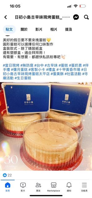 各位美食大大 晚安 有沒有 推薦的 古早味蛋糕(圓形的) 在版上搜尋 資訊都比較久了 主要也都是長形的 希望星期日可以取貨(剛好隔天慶生) 星期日 剛好在昌平路一段 上課 中午下課 可以順路去拿 住家住在南大里 再請各位美食大大 推薦了! --------------------------------------------------- 照片已經附上 聽太太說的確像是拜拜的 但壽星是滿週歲的女兒 所以想多方參考 添加物盡量少這樣感謝大家 https://i.imgur.com/hMZ9eXz.jpeg