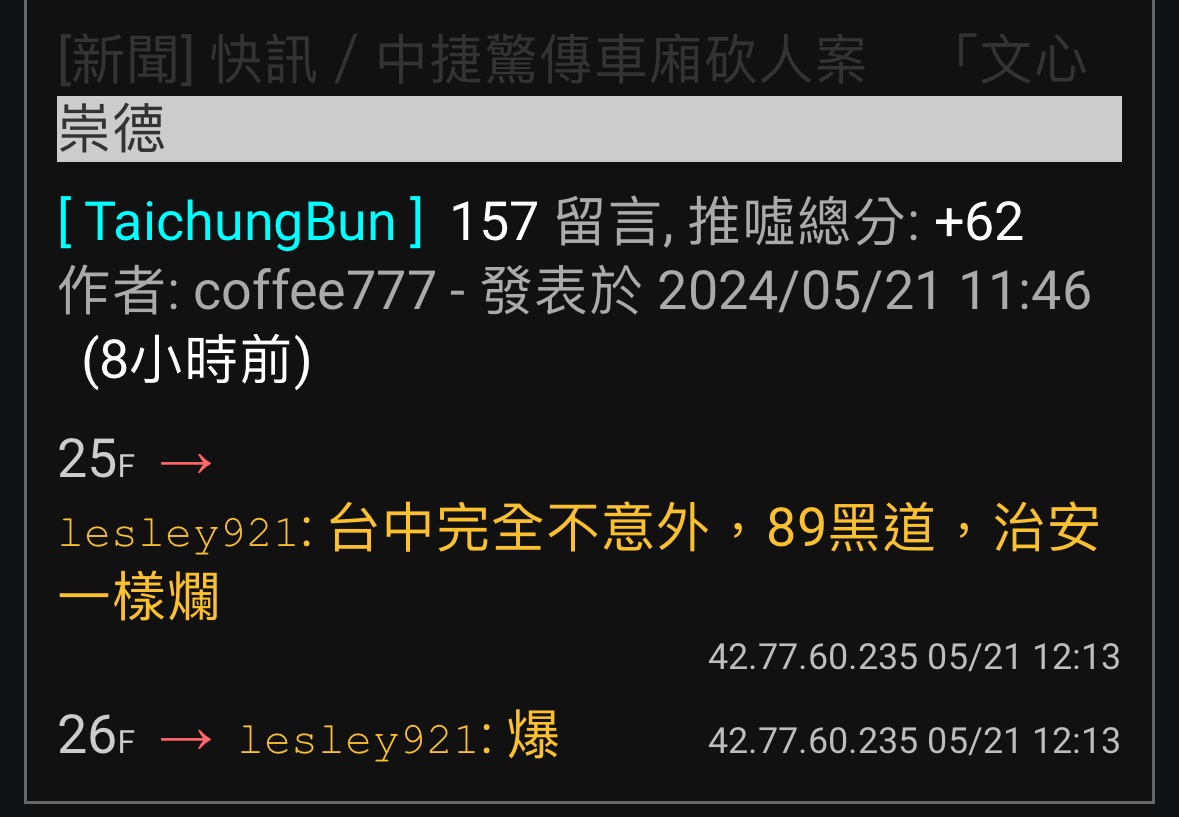 推 apple6: 台中捷運殺人犯是民進黨台獨支持者,真是 114.46.245.16 05/21 19:51