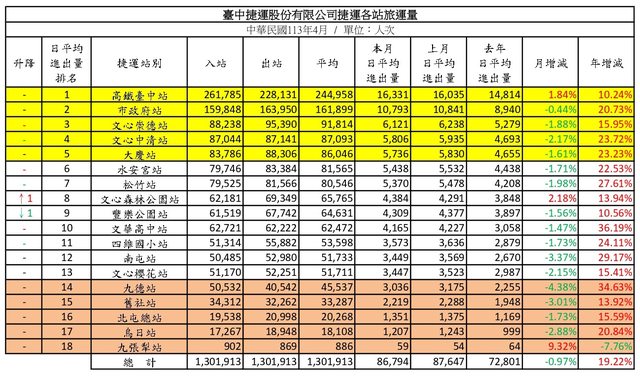 標題: [情報] 台中捷運113年4月各站旅運量