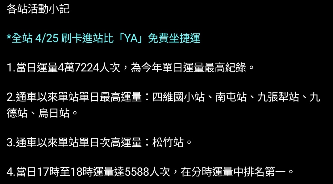 標題Fw: [情報] 台中捷運113年4月各站旅運量