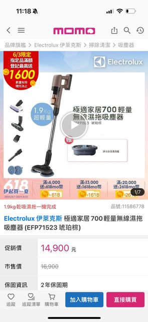 物品:Electrolux 伊萊克斯 極適家居700輕量無線濕拖吸塵器(EFP71523 琥珀棕)