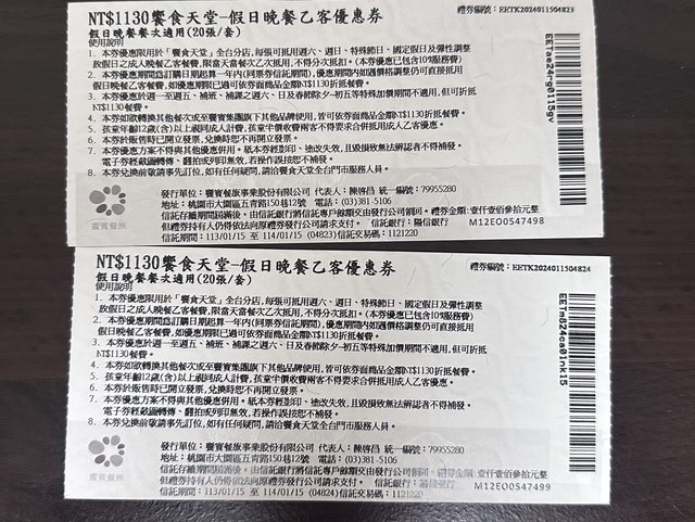 物品:饗食天堂假日晚餐券2張