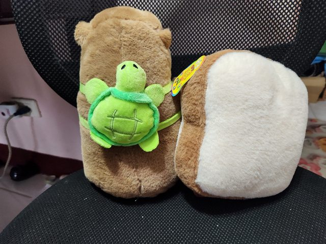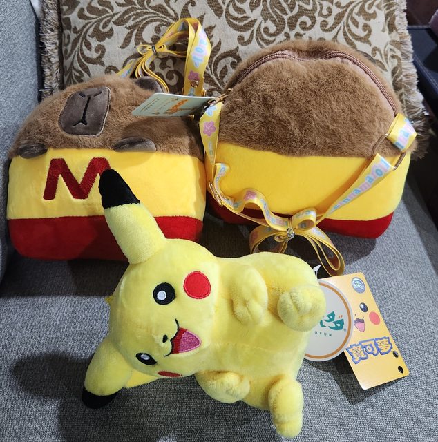 物品B/價格 全新卡皮巴拉側背包、卡皮巴拉娃娃、皮卡丘、角落生物椅子,每樣$100 物品B實照