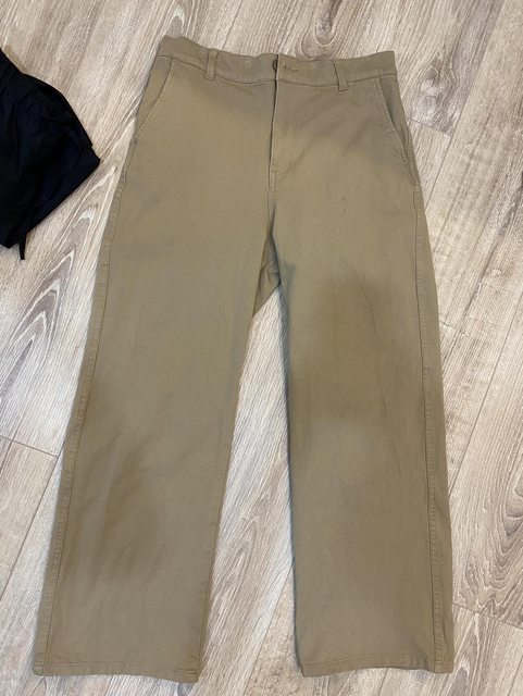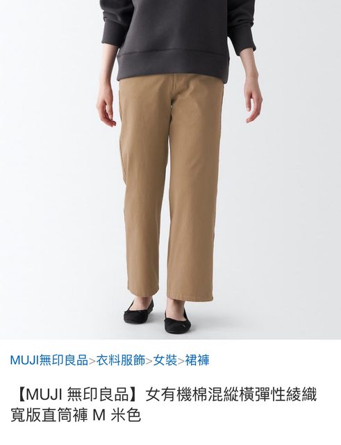 4.muji 女有機棉混縱橫彈性織綾寬版直筒褲 米色L(實品色較接近官網圖喔)/售350元
