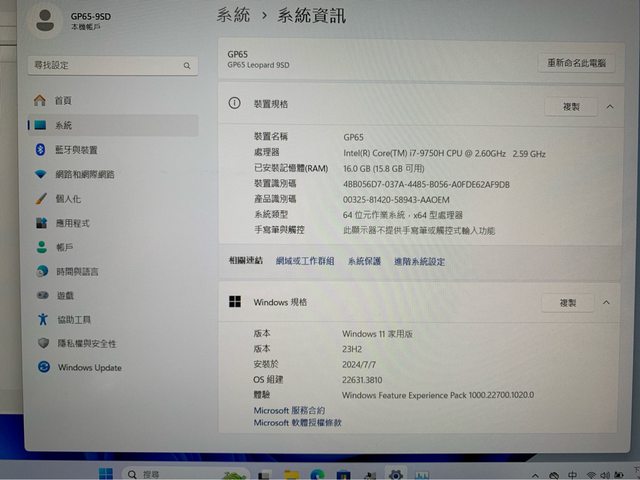 ◎筆電型號:MSI GP65 9SD