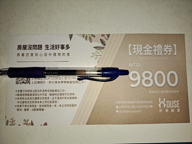 物品:驗屋公司現金禮券面額9800