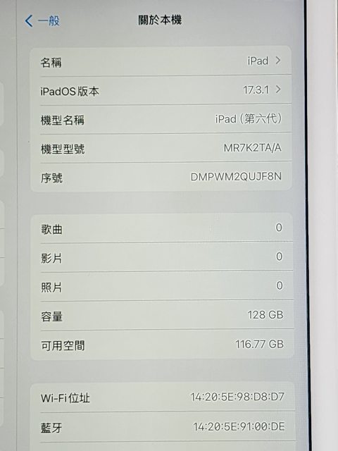 標題[交易] 售二手iPad6 WiFi128G白+無法充電AP1代