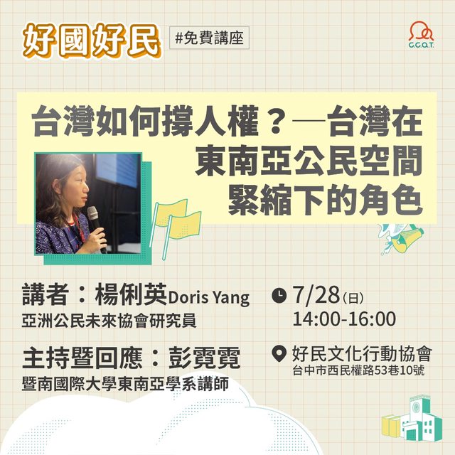 07.28【好國好民講座】台灣如何撐人權?─台灣在東南亞公民空間緊縮下的角色