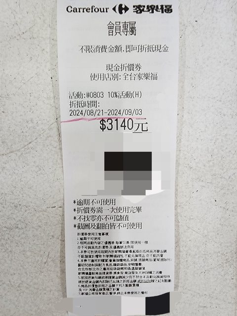 1.折價券不適用於購買:會員換購活動商品、菸類、酒類商品(葡萄酒除外)、藥局藥品、防疫專用酒精、嬰幼兒奶粉與配方食品、快篩試劑、台北市/新北市之專用垃圾袋/兩用袋、家樂福量販商品提貨券、儲值禮物卡、儲值家樂福錢包、享樂券、運送安裝、虛擬加值(線上遊戲點數卡)、大宗採購、美食街、商店街之消費金額。