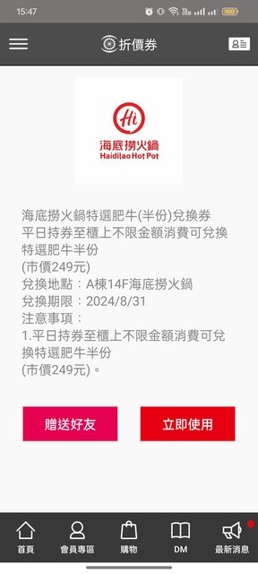 物品說明:A棟14樓海底撈平日不限金額兌換特選肥牛半份