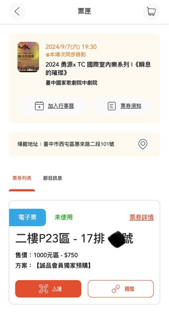 物品A/價格 2024勇源xTC國際室內樂系列I瞬息的璀璨 票券x1/750