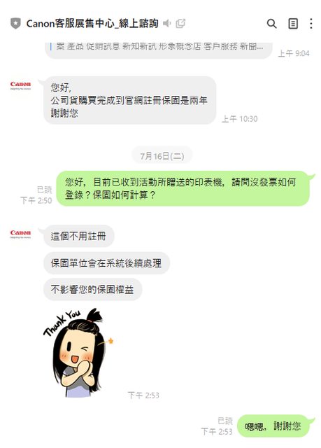 Canon回覆內處自行處理,所以我也不曉得保固多久。