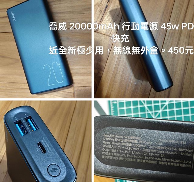 15. 450元,45W行動電源20000mAh,罕用近全新,無包裝盒,可充筆電
