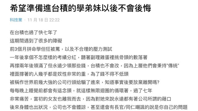 → Nerv : 所以台積用腳鏈綁住員工?不就是找不到更好的才腿 11/22 06:58