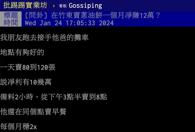 → twpost : 一張蔥油餅 能淨賺50元真的厲害 01/29 13:14