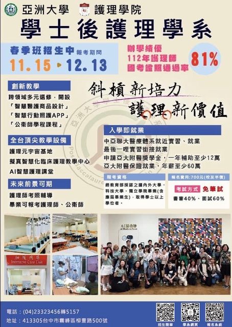 標題亞洲大學學士後護理學系113學年度春季班招生